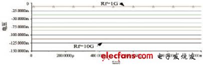 同理讓Rf從1G到10G以步長1G進(jìn)行參數(shù)掃描,從圖6掃描結(jié)果可以看出反饋電阻越大,其輸出電壓越大,與理論分析反饋電阻越大,反饋電容放電越慢,輸出電壓越大相一致。
