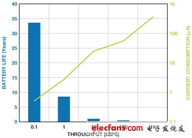 圖3所示為通過(guò)CR2032鋰電池供電時(shí)AD7091R的典型功耗和計(jì)算得出的電池壽命。可以清楚看出,隨著吞吐速率降低,電池壽命明顯延長(zhǎng)。