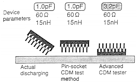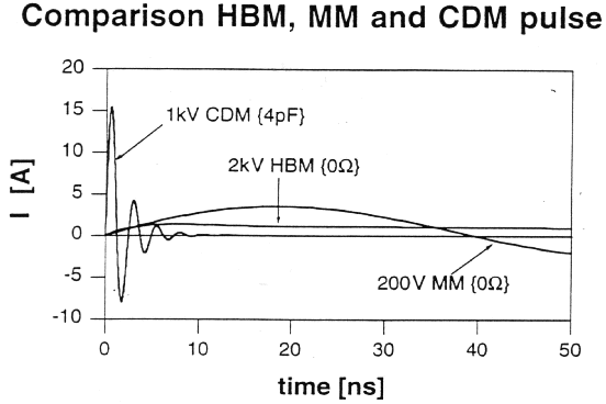 2132 )、機器放電模式(Machine Model)、元件充電模式(CDM: Charge-Device Model)、電場感應模式(FIM: Field-Induced Model),但是業界通常使用前兩種模式來測試(HBM, MM)。