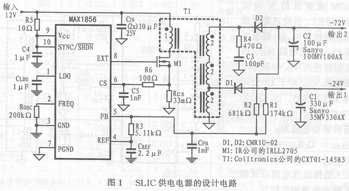 圖1是為SLIC設(shè)計的電源電路,它的輸入電壓為12V,其中一路輸出-24V/400mA,另外一路為-72V/100mA,通過改變外部分壓電阻可對兩路輸出電壓進(jìn)行調(diào)節(jié)。