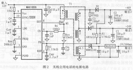 圖2所示是一種無線公用電話的電源電路,該電路也可以作為無線WLL終端的電源電路。若無線終端的供電電源是12V太陽能電池,則輸出要求第一路為24V/200mA,另一路為-48V/100mA,第三路為5V/500mA。