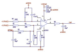 信號預處理模塊主要包括四階低通濾波電路和同步方波變換電路。根據國家對諧波測量儀器的要求,A級儀器頻率測量范圍是0~2500Hz,故每周波每路采樣128點。根據工程經驗,采用截止頻率為1500Hz的四階巴特沃斯低通濾波器,完全可以達到較好的濾波效果。同時為了提高測量精度,采用了自適應調整采樣間隔技術,即根據捕獲單元測量的頻率自動調整。本系統采用同步方波變換電路部分實現頻率的測量,同時為提高共模抑制比,同步方波變換電路采用開環方式實現電壓比較并將其輸入到同相端,同時在反相端輸入? +1.5V的比較電平,這樣在輸出端即引腳6處可得到占空比為50%的方波,其中電容C5起抑制高頻噪聲的作用。同步方波變換電路圖如圖3所示。