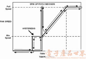 自動風扇速度控制回路能夠保證在任何給定的溫度條件下風扇都能在最佳速度下運行,使得系統的電流消耗最小和產生的音頻噪聲最低。這個回路將風扇在預先設定的溫度下接通,當溫度發生變化時再調整速度。對最低溫度、溫度范圍、滯后量和電扇啟動時間編程來確定線路中的運行參數,如圖3所示。風扇由于慣性不能以最低轉速啟動。為了克服接通時的慣性,將增加脈沖寬度直到風扇穩定運行,然后降低脈寬至風扇達到被測溫度所確定的速度。如果風扇被卡住或斷開而出現故障,回路會產生一個中斷信號。