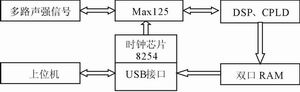 圖1為聲強測試系統的結構簡圖,圖中多路聲強信號在MAX125中實現A/D轉換后,采樣結果通過中斷方式輸入DSP中進行運算處理(FFT變換、相關分析、功率譜分析等),處理結果由USB接口送至主控計算機存儲和顯示。CPLD實現模塊接口控制邏輯,包括地址跟隨、數據鎖存等功能,8254則為MAX125等提供時鐘信號,便于上位機對時鐘信號的控制。