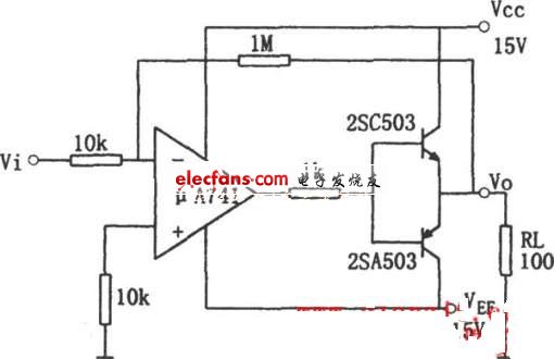是在運放的輸出端加上互補對稱射極跟隨器,這種形式結構簡單,使用方便,但電源利用率較低。由圖(a)知,電路中兩個三極管的射極分別串接了電阻RE(1.2Ω),其作用是對功放三極管實施過流保護,在集成運放的輸出端(引腳6)外接1kΩ的電阻,對μA741也起過流保護