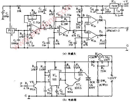 熱釋電紅外傳感及光照雙控延時節能燈電路圖