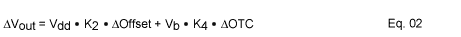 Compensation for the sensor output offset characteristic is provided by the Offset DAC and OTC DAC. As with the Span and SpanTC DACs, the offset correction DACs are arranged to provide both fixed (referenced to VDD) and temperature dependent (referenced to bridge voltage) outputs. The Offset and OTC DACs provide outputs that are a positive or negative fraction of their reference voltages. The modification to the output of the system of Figure 2, provided by these offset correcting DACs, is then of the form shown in Equation 2.