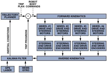 導航系統使用一個增強的卡爾曼濾波器3,通過結合多個傳感器的數據來估算行程圖上機器人的姿態。Seekur 上的測程數據從車輪牽引和轉向編碼器(提供轉換)和MEMS陀螺儀(提供旋轉)獲得。