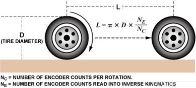 測程反饋系統利用光學編碼器對驅動和轉向軸旋轉的測量結果來估算機器人的位置、駛向和速度。在光學編碼器中,用一個碟片阻擋內部光源,或者通過數千個微小窗口讓光源照射在光傳感器上。碟片旋轉時,便會產生一系列電脈沖,這些脈沖通常被饋入計數器電路。每旋轉一圈的計數次數等于碟片內的槽孔數目,因此可從編碼器電路的脈沖計數計算旋轉數(包括小數)。圖4提供了將驅動軸旋轉計數轉換成線性位移(位置)變化的圖形參考和關系。