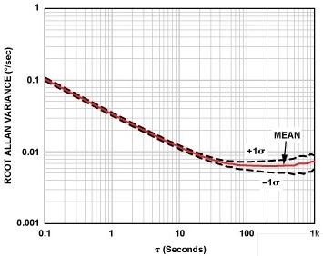偏置誤差可分為兩種:當前誤差 和條件相關誤差。Seekur系統估算的是未運動時的當前偏置誤差。這要求導航電腦能夠識別未執行位置變化命令的狀態,同時還要方便進行數據收集偏置估算和校正系數更新。該過程的精度取決于傳感器噪聲以及可用于收集數據并構建誤差估算的時間。如圖7所示,Allan方差曲線提供了偏置精度與求均值時間之間的簡便關系式,進而確定了ADIS16265的關系式。ADIS16265是一款與Seekur系統目前所用的陀螺儀類似的iSensor? MEMS器件。本例中,Seekur可將20秒內的平均偏置誤差減小至0.01°/秒以下,并可通過在約100秒的周期內求均值來優化估算結果。