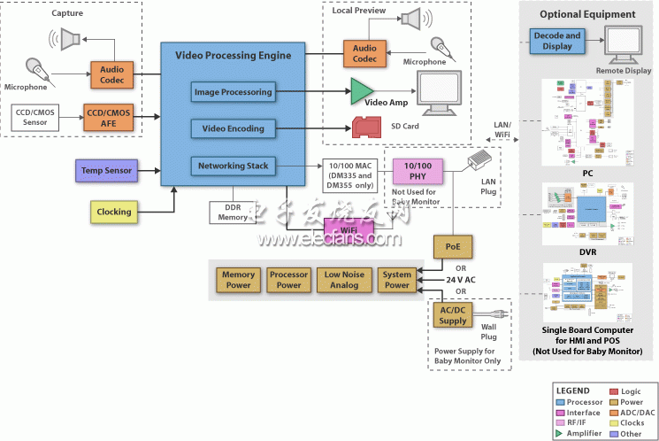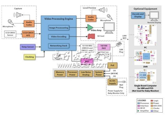 可視門鈴和嬰兒監護系統這兩款看似無關的解決方案,卻在將視頻和音頻在不同位置間傳輸這一方面提供了相同的功能,并在這一方面有著幾乎相同的需求。它們有一些細微的差異,但主要的差異在于連接和提供的電源??梢曢T鈴可以用有線或無線連接,而嬰兒監護系統通常僅采用無線連接。如果將可視門鈴集成到住宅或建筑基礎設施中,則可提供以太網供電、24V 交流電或其它任何離線電壓。系統核心是低功耗嵌入式處理器 - DM3xx、OMAP-L13x 或 AM35xx。實施實時視頻顯示(無視頻編碼)時,系統總功耗低于約 100mW。即使具有完整視頻編碼(壓縮或存儲所需),消耗的系統總功耗仍低于 400mW。
