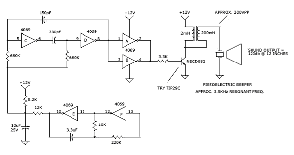 掃頻式驅蟲電路可發出20~60kHz的掃頻超聲波,采用BTL結構功放,輸出功率可達4W,主要適用于食堂、糧庫、庫房等場合的驅蟲、驅鼠。