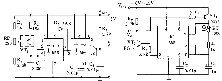 如圖所示,IC1為雙時基電路556,其中左半(1/2 556)與R3、VT1、c1等組成溫度/頻率變換多諧振蕩器,IC1-2(1/2 556)與R4、c3組成單穩觸發器。VT1采用PNP二極管作為溫度傳感器,當溫度在0~100度范圍內變化時,由于管子內阻隨溫度的變化,使振蕩頻率的變化范圍為3.4kHz~5kHz,線性誤差小于正負0.5度。IC1的輸出經IC2單穩觸發器整形,得到脈寬恒定的矩形波。
