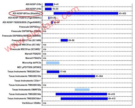 低成本是幾乎所有產品開發不可回避的問題。近年來,ADI在提供低成本Blackfin處理器及配套產品上不遺余力,最新的BF50x和BF51x系列處理器均提供了多款低于5美元的產品。ADI還針對BF50x系列新推出了低成本的(199美元)EZ-KIT Lite評估套件,為處理器評估提供了最經濟實惠的選擇。同期在中國全面上市最新款超低價、高性能Blackfin仿真器ADZS-ICE-100B首次將價格降到150美元的新低,為設計師提供了低成本、高性能的設計工具。如圖1所示,獨立評估機構BDTI對定點處理器的每美元速度比評估中,Blackfin處理器具有優異的表現。