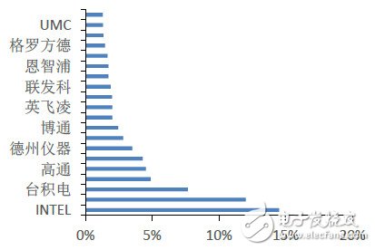 我們將半導體產業(yè)所有公司排名,發(fā)現(xiàn)英特爾、三星電子、臺積電位列前三甲,市占率分別為14.49%、11.98%和7.65%,分別是電腦、智能手機和存儲、代工領域的領導者。在TOP20中沒有中國廠商的身影。