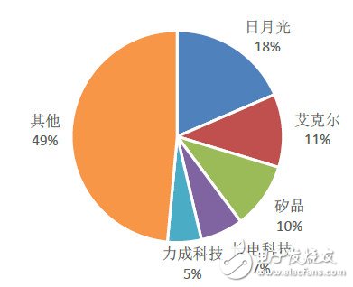 根據(jù)Gartner數(shù)據(jù),2014年全球封裝市場271.3億美元,2015年-2020年維持5%的復合增長率。根據(jù)集邦科技數(shù)據(jù)顯示,2015年全球封裝測試份額日月光、艾克爾、矽品、長電科技和力成分別占據(jù)19%、11%、10%、7%和5%的市場份額。這個格局目前正在變化中,較為顯著的變化在于日月光與矽品的合并,兩者合并主要為抵抗來自于紫光集團的收購,另一個變數(shù)在于艾克爾可能被大陸廠商收購。從未來趨勢來看,大陸廠商承接的芯片代工業(yè)務會逐步增多,下游的封裝測試向大陸轉移也在情理之中。