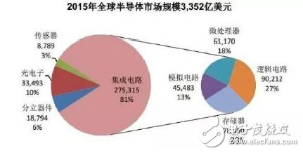 2015年全球半導體市場規(guī)模3352億美元,其中集成電路占比最高為81%,其余光電子、分立器件、傳感器等分別占據(jù)10%、6%和3%的份額;更進一步看,集成電路細分下去發(fā)現(xiàn),邏輯電路、存儲器、微處理器和模擬電路等分別占27%、23%、18%和13%。