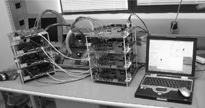 該芯片在8層金屬、0.15mm、1.2V的CMOS工藝中集成了大概7800萬個(SRAM約占6600萬個)晶體管。SPI4.2接口以450MHz DDR運行,有效吞吐量可達900Mb/s。該芯片功率為6W,采用定制設計的1803 FCBGA封裝。電路的性能和系統驗證電路板如圖2a和圖2b所示。