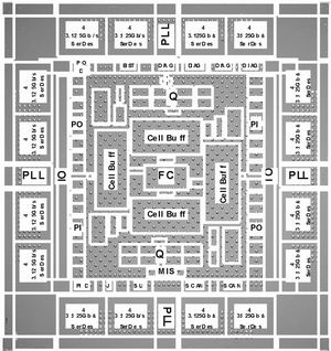 因此,此芯片首次投片就滿足了功能設計和電子設計的需求,并在8層金屬的130nm低壓(LV) CMOS工藝中實現,同時集成了大概7600萬個晶體管和高達625MHz DDR的時鐘,封裝形式為1932 FCBGA封裝。