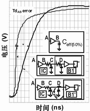 數字的、非線性高效電流源模型(ECSM)用于表征瞬時驅動充/放電流,專為各電路中的每一個輸入到輸出時序通路而創建,應用于特定節點的RC連線模型中,以計算驅動點和受驅動點雙方的信號壓擺率和連線延遲(見圖7a和7b)。
