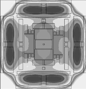 類似于一個圓的獨特雙軸對稱布局規劃(見圖3)使整個電路的連線總長度最短并使頂層設計的布線堵塞最小化,從而優化頂層布線網絡(見圖4a),同時該元件的電氣功能正確,最大溫度梯度為25攝氏度(見圖4b)。
