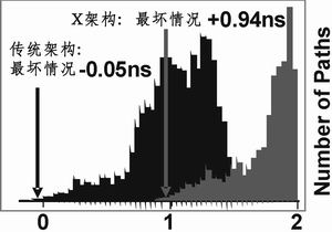 圖10b為傳統架構同X架構設計的靜態時序分析(STA)比較柱狀圖,使用X架構可將最壞情況下通路延遲間隙(slack)從-50ps增加到+940ps。