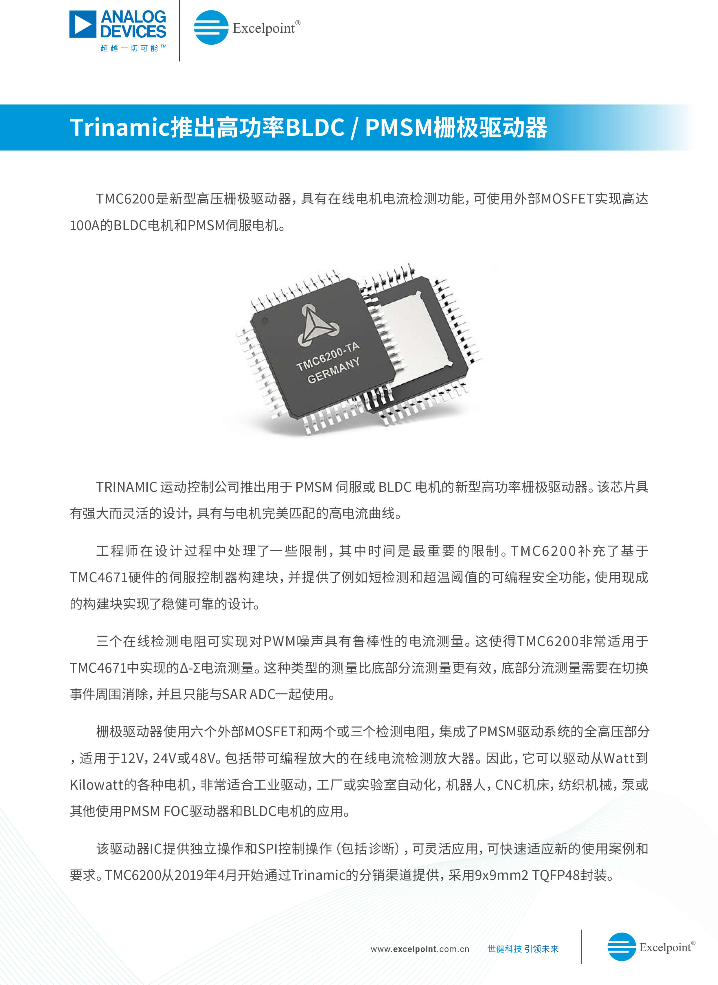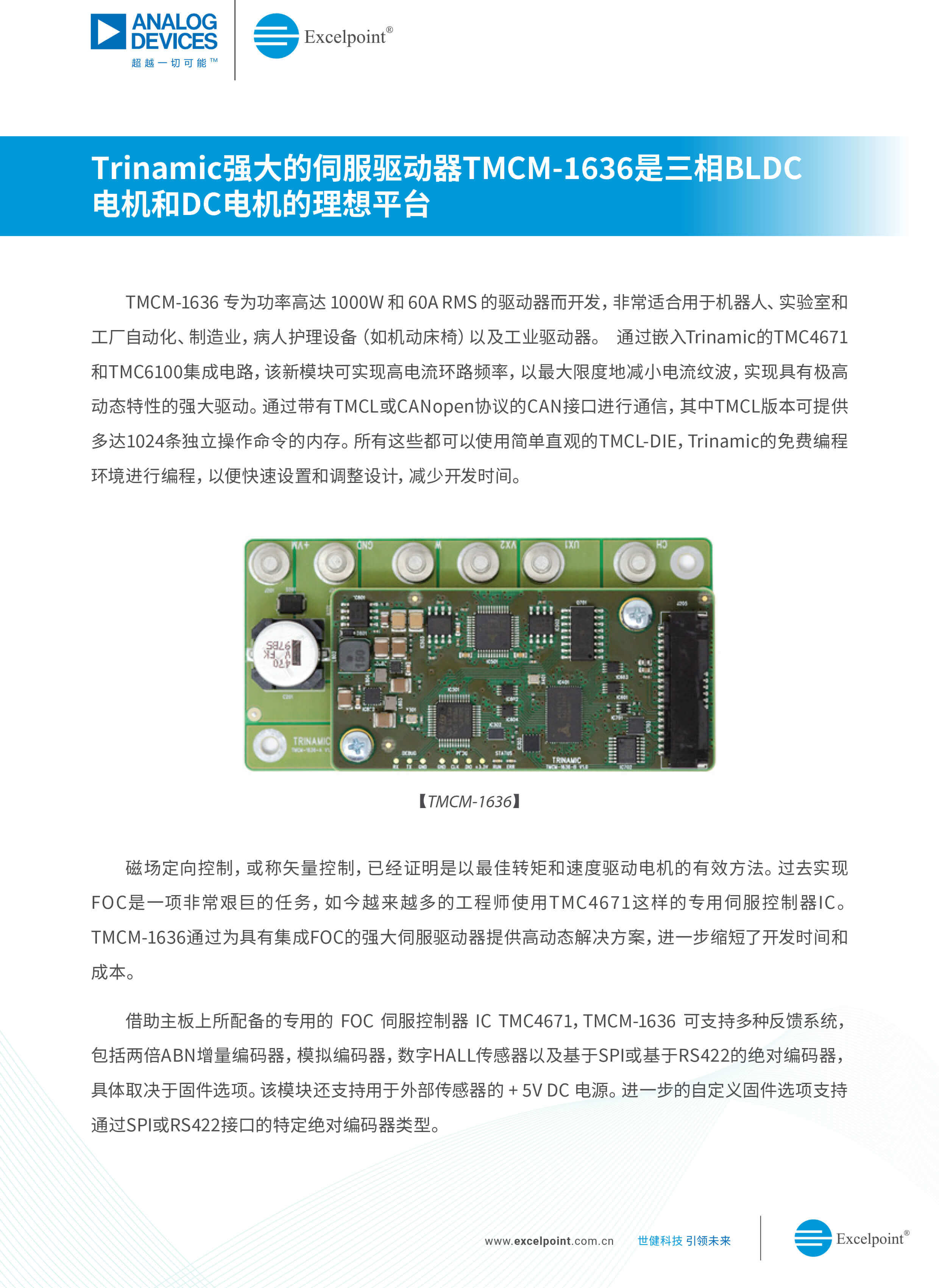 與ADI合作三十多年的技術型授權代理商Excelpoint世健,為大家呈現ADI電機伺服控制與驅動解決方案。ADI在電機運控領域有著深厚的技術積累,能夠提供應對電機系統各種設計難題的方案。通過高集成度的設計,這些高性能運控驅動芯片在高速度、高響應和高精度上表現十分出色,在電機領域有著廣泛應用,能有效幫助客戶降低精密運控的實現難度。