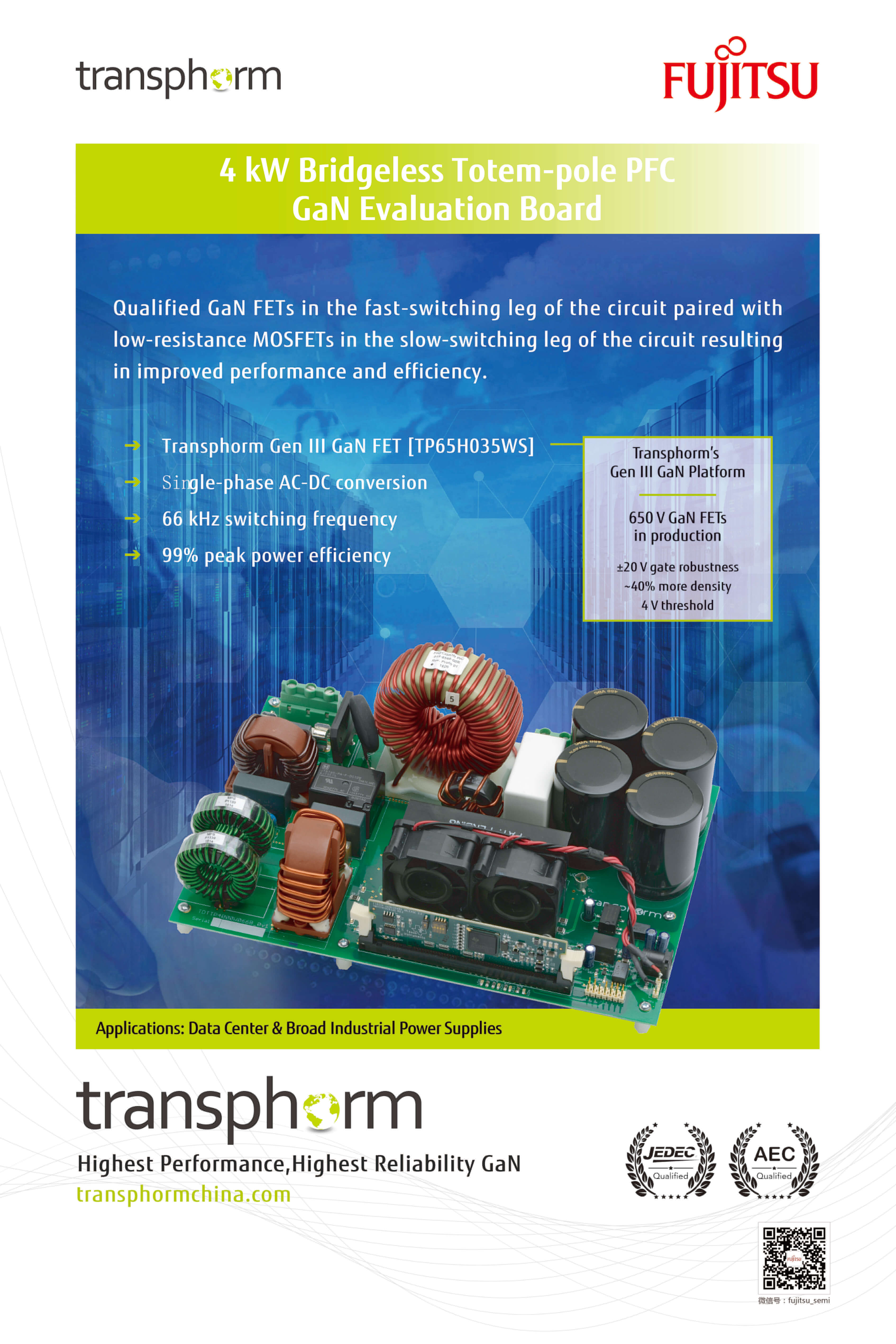 富士通電子代理的Transphorm帶來的是4KW Totem Pole PFC評估板TDTTP4000W066B,可應用于工業(yè)系統(tǒng)及數(shù)據(jù)中心的電源供應。其采用了第三代650V GaN FET(TP65H035WS),通過更低的柵極電荷、更快的切換速度和更小的反向恢復電荷,提供更高的效率(峰值效率可達99%以上)。采用Transphorm的氮化鎵(GaN)電源解決方案,還可以使電源縮小尺寸,減輕重量,相較于傳統(tǒng)硅(SI)器件具有顯著優(yōu)勢。