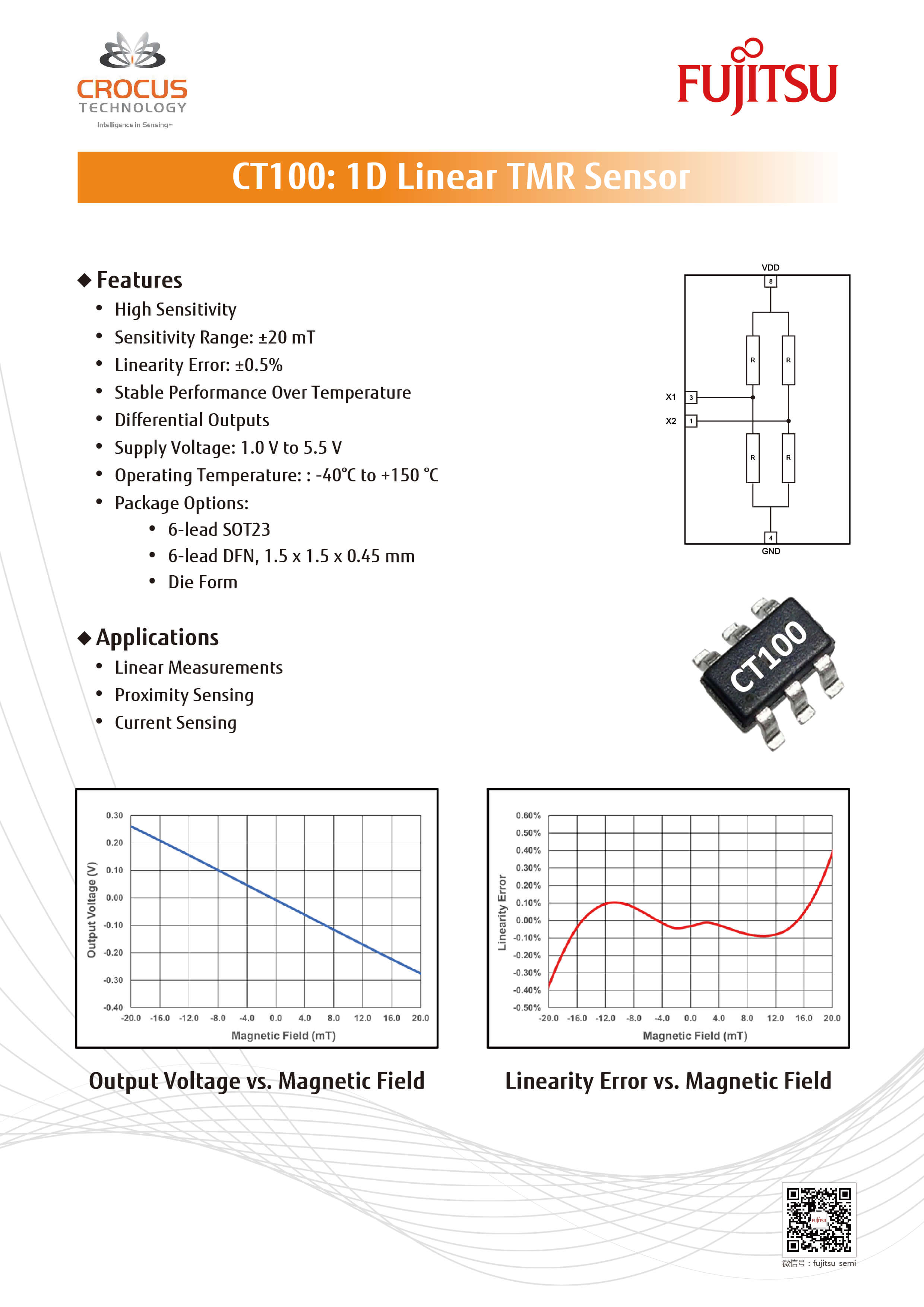 突破性隧道磁阻(TMR)傳感器領先供應商 Crocus Technology,現在已經是富士通電子的代理品牌之一,該公司的 CT834-TMR 模擬傳感器,基于Crocus TechnologyMLU? 專利技術,非常適合消費者和工業市場。