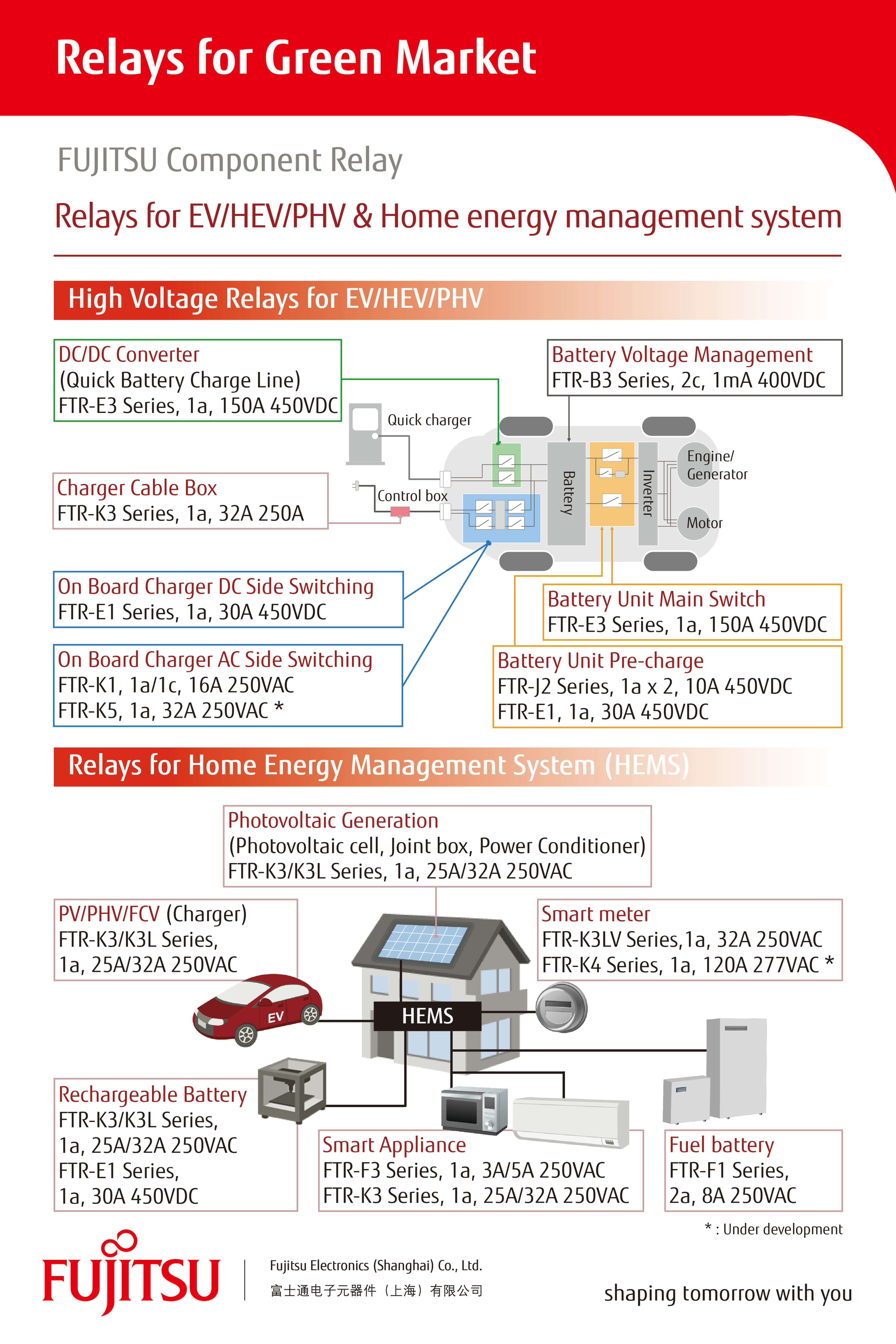 富士通繼電器支持從PV到智能電網等各種綠色應用,其中FTR-E1系列適用于PV能源DC充電;FTR-K1系列適用于AC電源轉換器;FTR-F4G系列適用于微型逆變器。