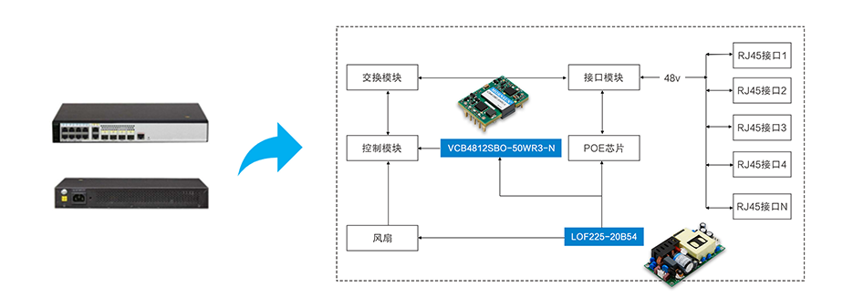 2)同時考慮到內(nèi)部負(fù)載供電,需要一個體積小功率密度比較大的DC/DC電源模塊降壓到12VDC給控制及其他交換機模塊供電,金升陽提供的30-100W1/16磚VCB系列電源是個不錯選擇,支持36-75VDC寬電壓范圍輸入,同時又能提供30W/50W/75W/100W等多種功率段給客戶選用,設(shè)計更為靈活。