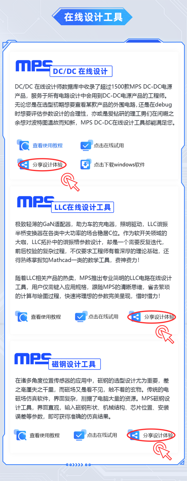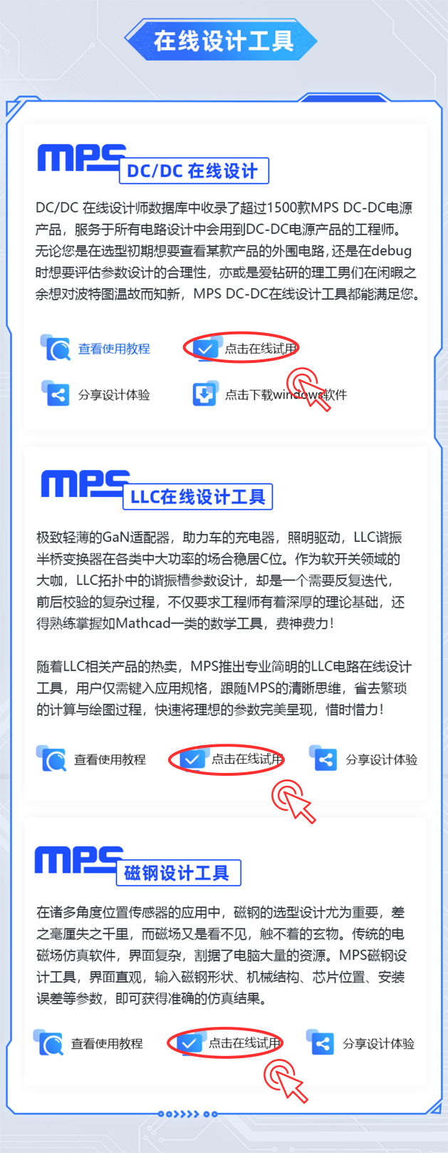 隨著LLC相關產品的熱賣,MPS推出專業簡明的LLC電路在線設計工具,用戶僅需鍵入應用規格,跟隨MPS的清晰思維,省去繁瑣的計算與繪圖過程,快速 將理想的參數完美呈現,惜時惜力!