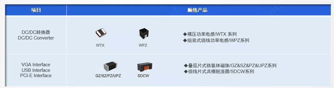 在服務器主板電路中,順絡電子可推薦用于CPU供電的組裝類功率電感WPZ系列,其他負載點供電的模壓功率電感WTX系列,用于濾噪的鐵氧磁珠PZ/UPZ/EPZ系列和繞線共模扼流器SDCW系列等。