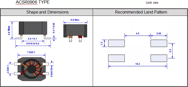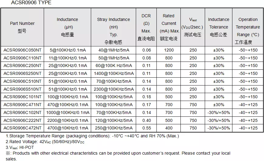 ACSR系列磁環共模扼流圈,采用繞線磁環結構設計,塑膠Case進行固定,提高產品機械性能與焊接性能,該產品特性值范圍在5~4700μH,產品使用溫度范圍在-50~+150℃,可對應不同高速差分信號接口抑制共模信號干擾,滿足AEC-Q200認證,可廣泛應用在CAN BUS車載總線共模噪聲的濾除。除總線上濾除共模噪聲之外,ACSR系列電流特性范圍在400~1200mA,可對應車載電源線共模噪聲的濾除。