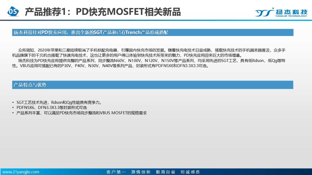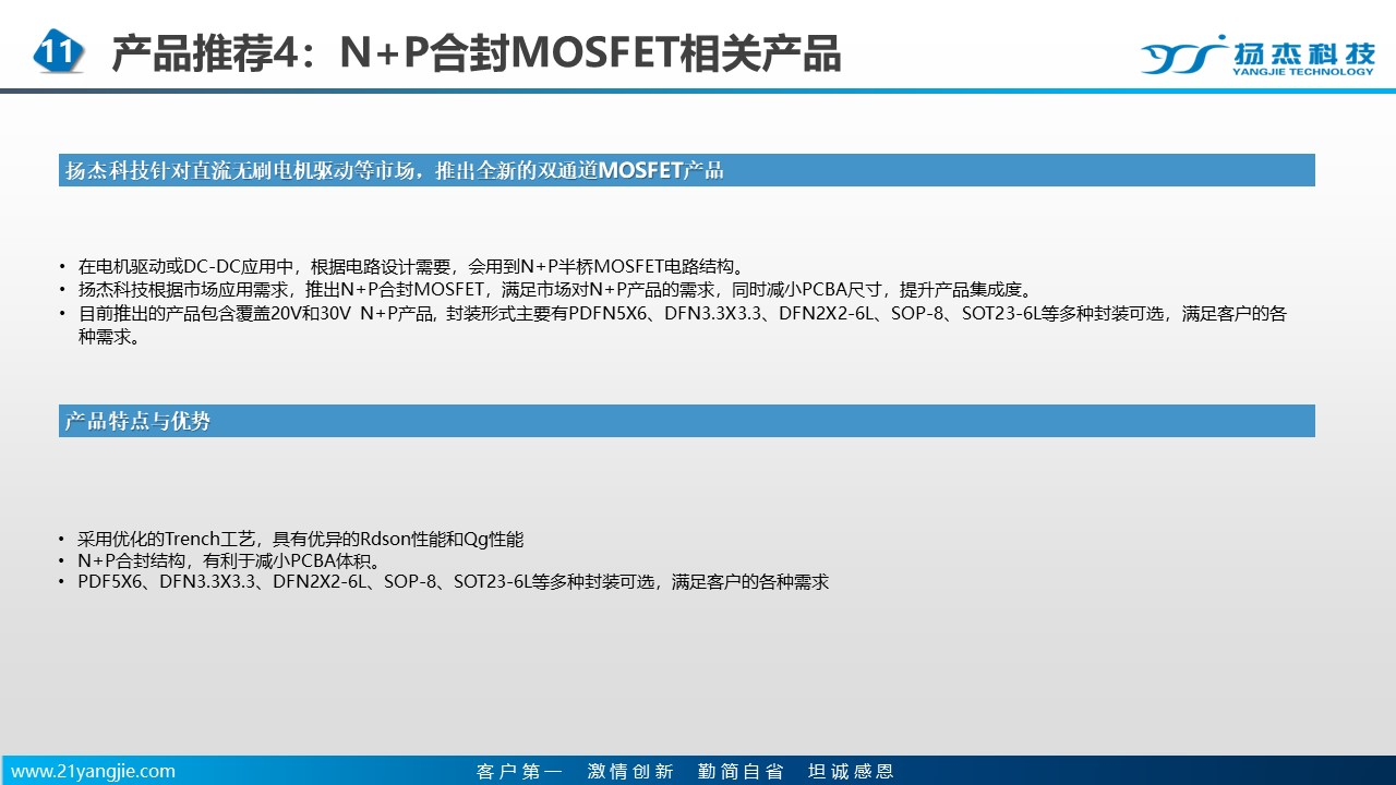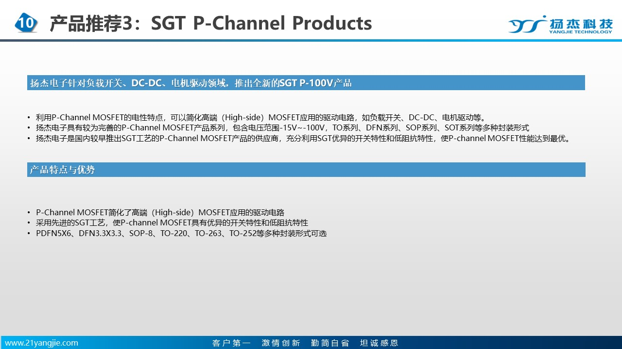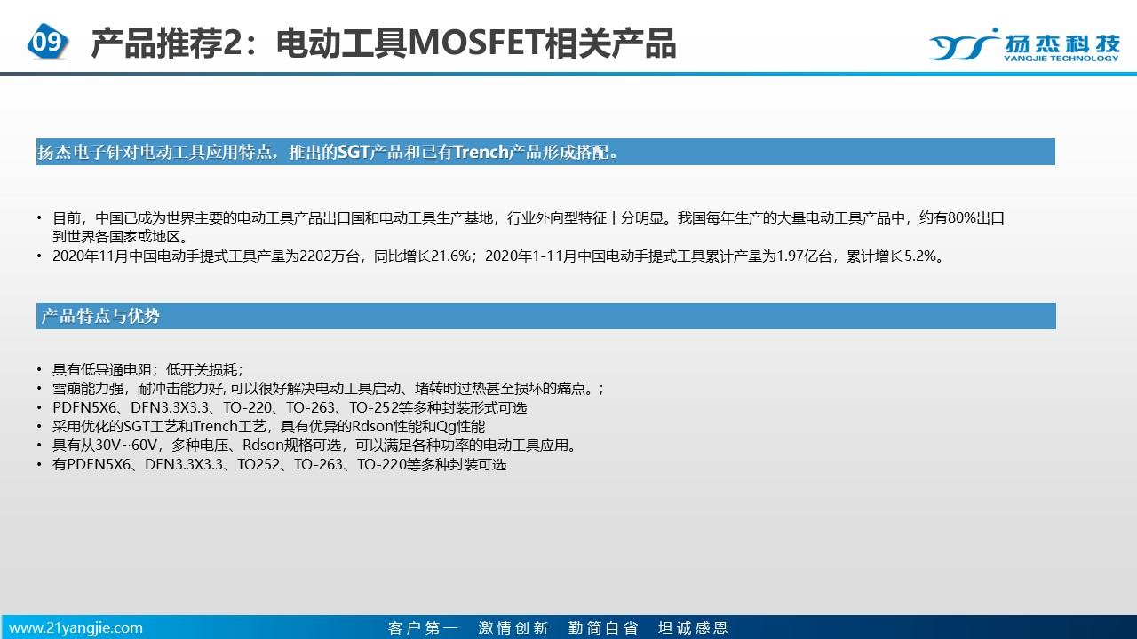 揚州揚杰電子科技股份有限公司(證券代碼300373)是國內少數集半導體分立器件芯片設計制造、 器件封裝測試、終端銷售與服務等產業鏈垂直一體化(IDM)的杰出廠商,公司成立于2000年,總 部位于江蘇省揚州市,注冊資金4.72億元,員工約3200人,面積120,000平方米,2020年營業額 約26.3億元。產品線含蓋分立器件芯片、整流器件、保護器件、小信號、MOSFET、功率模塊、碳 化硅等,為客戶提供一攬子產品解決方案。公司產品廣泛應用于電源、家電、照明、安防、網通、 消費電子、新能源、工控、汽車電子等多個領域。揚杰科技連續4年被中國半導體行業協會評為“中國半導體功率器件十強企業”,在中國功率二極管市場份額處于領先地位。