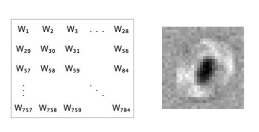 我們并不展開像素,而是將權重看成一個28x28的網格,其中權重的排列方式與對應的像素完全一致。上圖右半部分和下圖看起來不同,但是它們都表達了相同的等式,即z = b + ∑ wx。