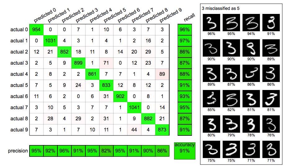 讓我們仔細看看上一篇的最后一個神經網絡的性能,它在MNIST數字上達到了90%的精確度。達到這個精確度的其中一個方法是查找一個混淆矩陣,這個矩陣將我們的預測分解成一張表格。在下面的混淆矩陣中,行對應MNIST數據集的實際標簽,列對應預測的標簽。例如,第4行(actual 3)、第6列(predicted 5)的單元格表示有71個3被我們的神經網絡誤標記為5。混淆矩陣的綠色對角線表示預測正確的數量,而其他所有單元格均表示錯誤的數量。