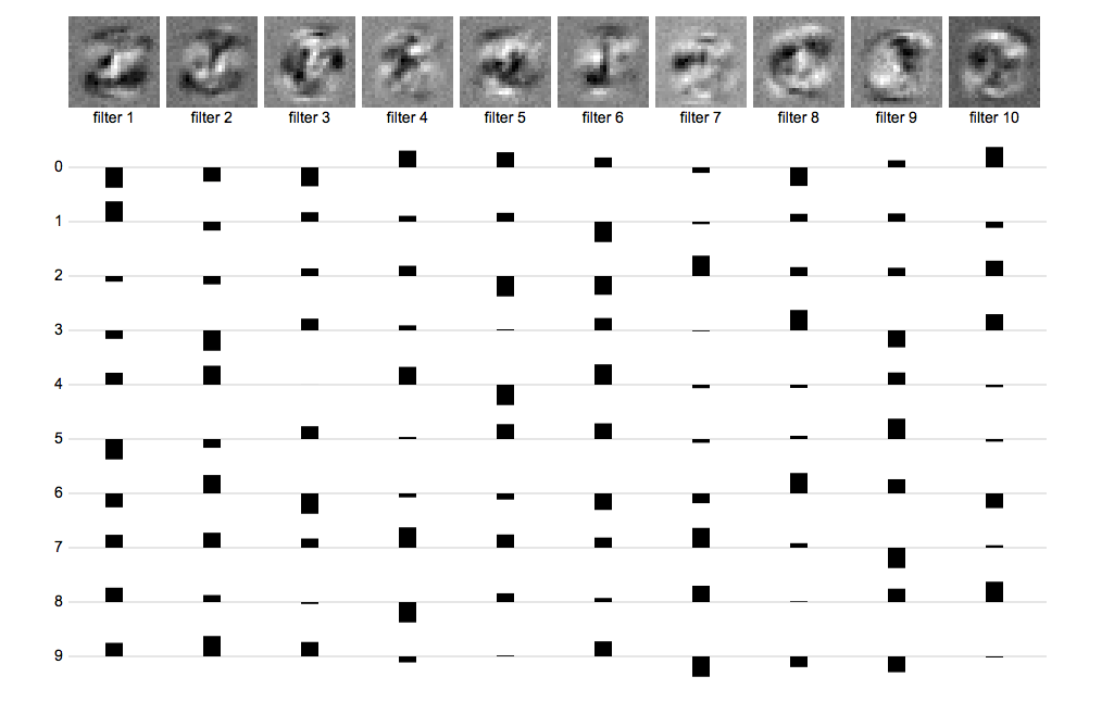 過濾器圖像下面的行對應于我們的輸出神經元,每行代表一個圖像類別。條形代表隱藏層傳遞給10個過濾器的激活對應的權重。例如,0類似乎偏愛外緣的值較高的第一層過濾器(因為數字零傾向于如此)。它厭惡中間的像素的值較低的過濾器(通常對應數字零中間的孔)。1類幾乎與此正相反,鐘愛在中間的值較高的過濾器,你可能已經想到了,那里對應數字1的豎筆。
