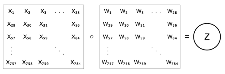當我們向神經網絡輸入圖像時,我們通過將像素“展開”為一列神經元來可視化網絡,如下圖左半部分所示。讓我們集中注意力到第一個輸出神經元的連接,我們將這個神經元標記為z,并將每個輸入神經元和相應的權重標記為xi和wi。