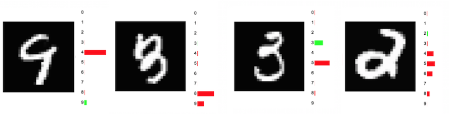 我們的單層MNIST網絡的一些錯誤。左邊兩個屬于可以理解的錯誤,右邊兩個則是明顯的錯誤