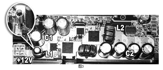 兩相供電電路為了給CPU提供足夠的電力,就需要高效率,為了通過大電流,電路中使用了相應的元件。如圖3中的L1部分,+12V輸入部分采用約1.5mm直徑的材料繞制的電感(L1),其橫截面積可以使它在通過較大電流的時候不會過熱。 而L2處兩個電感都采用3股直徑1mm的材料繞制,提供了更大的橫截面積,這樣,電流在通過電感時的損耗可以降低到最小。其他廠商在此處大多使用單根材料繞制,那樣會產生更多電力損耗,引起電感發熱。