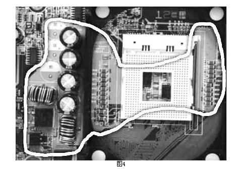 剛才介紹了電感部分,同樣主板上面的銅箔也是關鍵的導體部分。銅箔相對比較薄,橫截面較小,如果電流通過橫截面較小的銅箔則容易引起損耗從而產生高熱。為了解決這一困擾,華碩的工程師在多層PCB板電源供給部分的每一層都采用了整塊銅箔的設計,至少4層銅箔組成了導體,可以提供足夠的橫截面積供電流通過。在圖4中用白線劃出的部分就是整塊銅箔的形狀,PCB電路板中間層的銅箔也是如此。