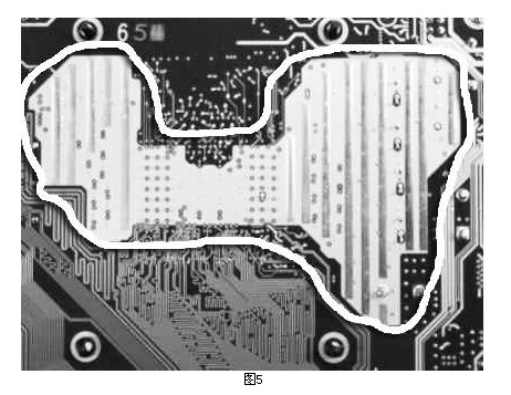 圖5是主板背面,為CPU供電電路部分的整塊銅箔,在上面還可以看到附加的錫條(銅箔面上焊了一層金屬錫),這也是為增加橫截面積而設計的。