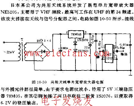 該裝置的應用電路工作原理見圖3。通常共用天線放大器和用戶電視機的電源開關是分離的。有時沒有一能