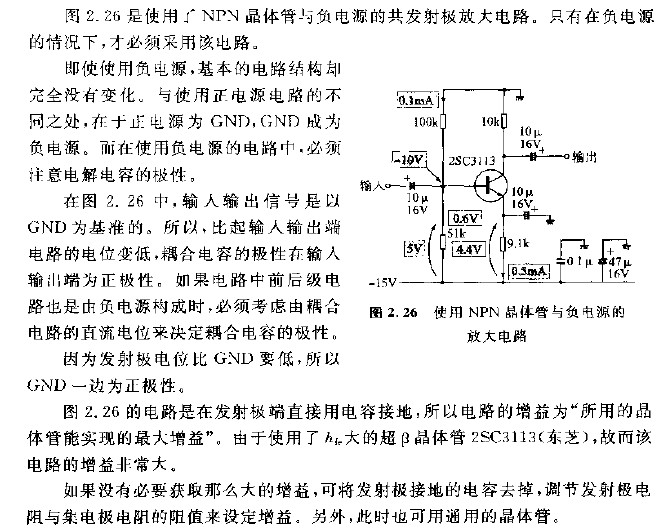 使用NPN晶體管與負電源的放大電路圖