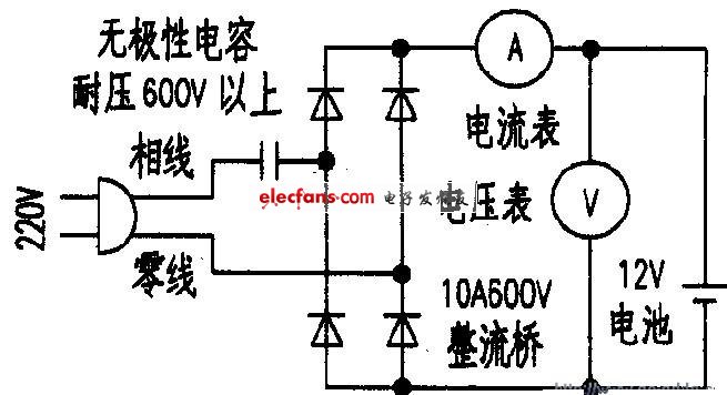 最簡(jiǎn)單的“恒流”充電器如圖所示。利用容抗降壓限流,容抗Xc=1/2πfC。式中π圓周率3.14,f市電頻率50Hz,C電容容量單位F。