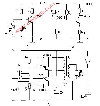 晶體管溫控電路圖如圖是晶體管組成的繼電器延時(shí)吸合電路。剛接通電源時(shí),16μF電容上電壓為零,兩個(gè)三極管都截止,繼電器不動(dòng)作。隨著16μF電容的充電,過(guò)一段時(shí)間后,其上電壓達(dá)到高電平,兩個(gè)三極管都導(dǎo)通,繼電器延時(shí)吸合。延時(shí)時(shí)間可達(dá)60s。延時(shí)的時(shí)間長(zhǎng)短可通過(guò)10MΩ電阻來(lái)調(diào)節(jié)。