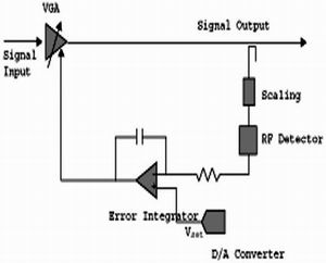 增益放大器的輸出通過一個檢測器進行測量,該檢測器又產生與其輸入信號rms成正比的DC電壓。該DC電壓與一個基準電壓進行比較,所得到的差值則完成積分。這就構成了為VGA提供的增益電壓的基礎。基準電壓的設定對應于接收信號的理想rms電壓值(要為ADC進行處理),它使得VGA對其輸出作出相應的調整。該基準往往是固定的,它能通過一個電位計產生。不過為了確保能獲得足夠的分辨率,以保證所期望的值,還要小心操作。