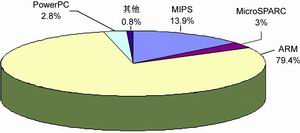 由此可以看出,8位MCU市場已逐步趨向穩定,32位MPU代表著嵌入式技術的發展方向,正在加速發展。在32位嵌入式微處理器市場上,基于ARM內核的微處理器在市場上處于絕對的領導地位(圖1),因此追蹤ARM技術的發展趨勢顯得尤為重要。