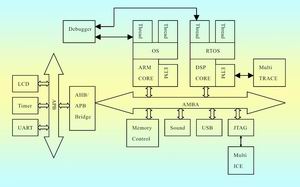 ARM公司最新推出的RealView是一整套完整的解決方案,由集成開發環境和在線仿真器Multi-ICE,實時跟蹤器Multi-Trace等組成。RealView支持多內核系統調試,多種操作系統的任務級或線程級調試,大大降低了高端ARM處理器的開發門檻,縮短了應用系統開發周期。圖2說明了復雜片上系統調試/跟蹤原理。